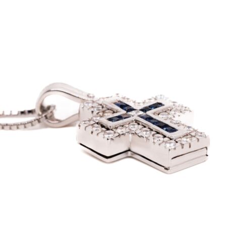 • Croce in oro 18 carati con diamanti carati 0,28 e zaffiri carati 0,54