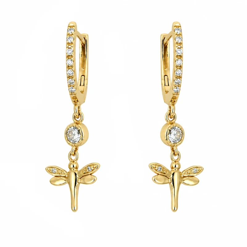 Orecchini con Libellule incastonate di zirconi bianchi, in Argento giallo 925.