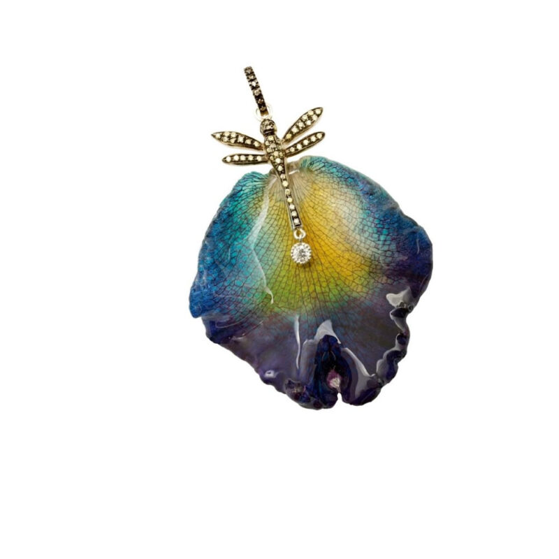 Pendente Libellula in Argento 925 incastonata con Zirconi Bianchi, montato con Petalo vero MOD. 238 C L